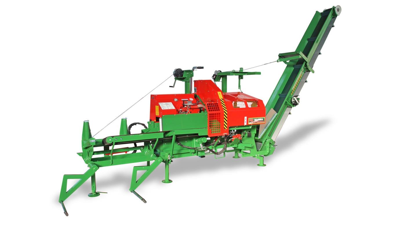 It can be used as a combined cutting and splitting machine and is equipped with a vibrating extension or conveyor belt as optionals for the lifting operations of splitted logs up to a height of 2.10 m (retractable after use). |