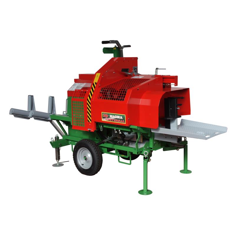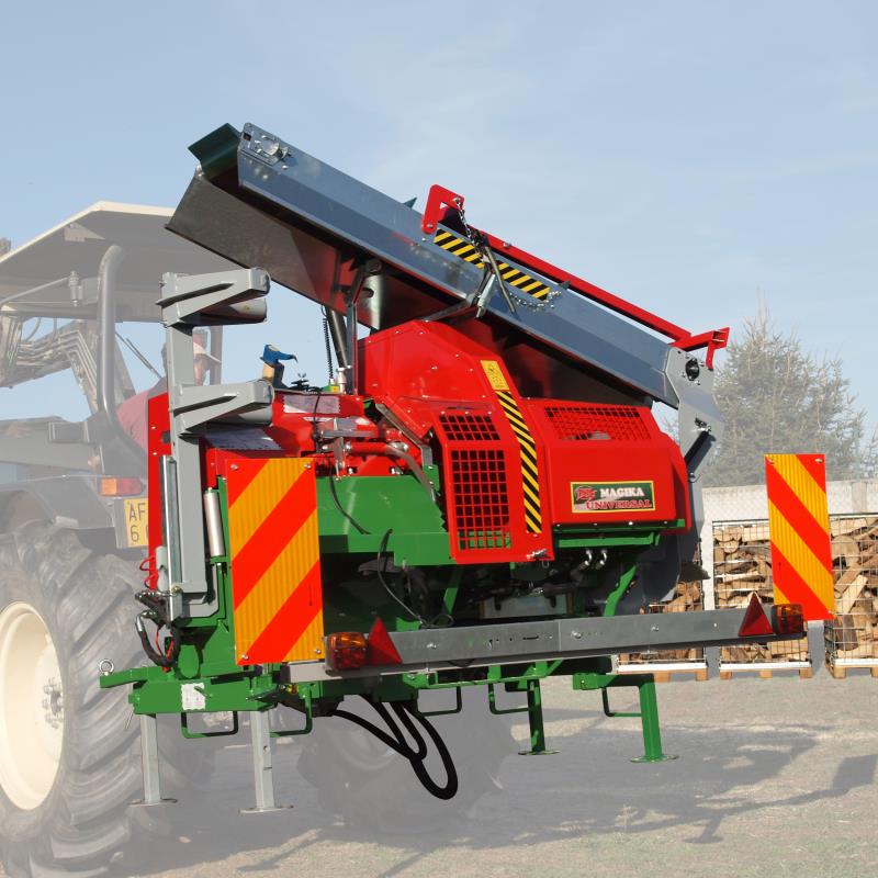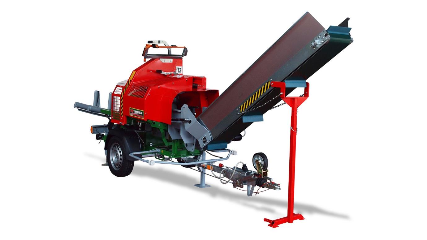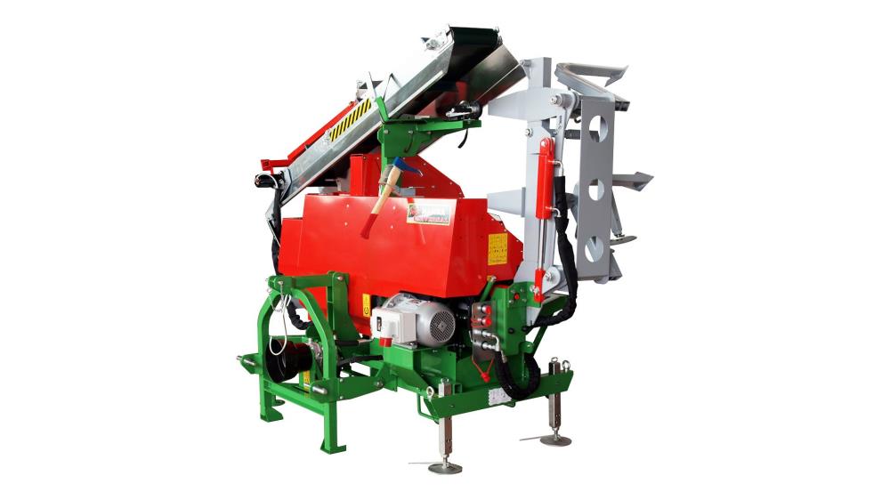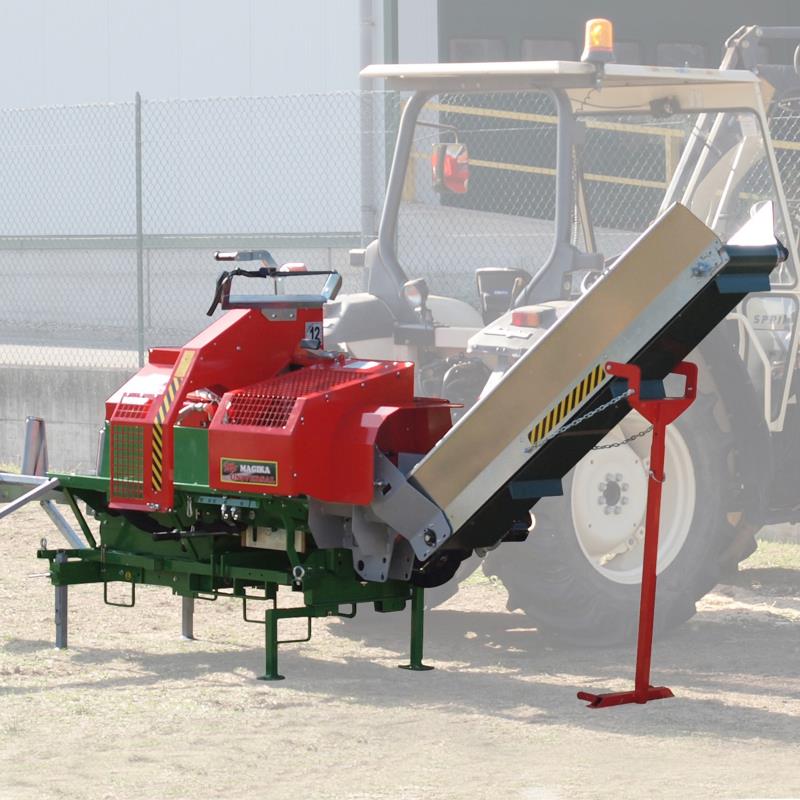 It can be used as a combined cutting and splitting machine and is equipped with a vibrating extension or conveyor belt as optionals for the lifting operations of splitted logs up to a height of 2.10 m (retractable after use). |